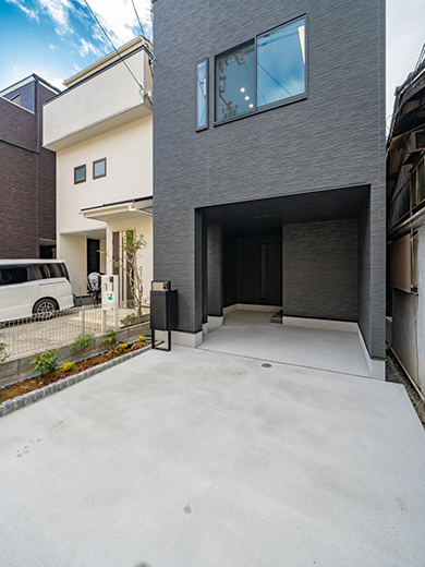 駐車スペースの一部に設けた植栽エリア。日常の暮らしに緑を取り入れ、住まいにやさしい彩りを添えます。