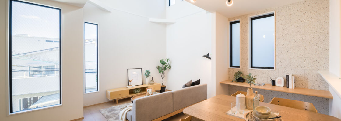 家の真ん中にプライベートな中庭&吹抜けを設け、それを囲む多くの窓のある住まいです。ダイニングでは、窓を開けて中庭の様子を伺うことができます。食事をしながら、空の明るさの変化も感じられます。