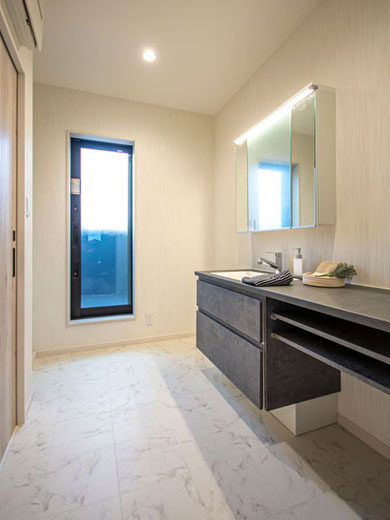 広々とした洗面脱衣室。お洗濯物を建物奥のバルコニーへ干すことで、建物正面側に生活感を出しません。洗面室からバルコニーへ直接出られる動線が便利です。(洗濯パンはこの写真左奥の死角位置にあります。)