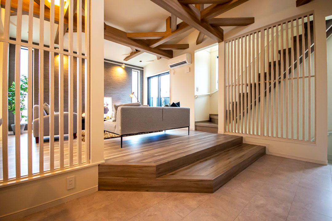 LDKは階段2段分の高低差がついたスキップフロア仕様になっています。リビングが少し上がることで、キッチンと目線が合い会話もはずみます。