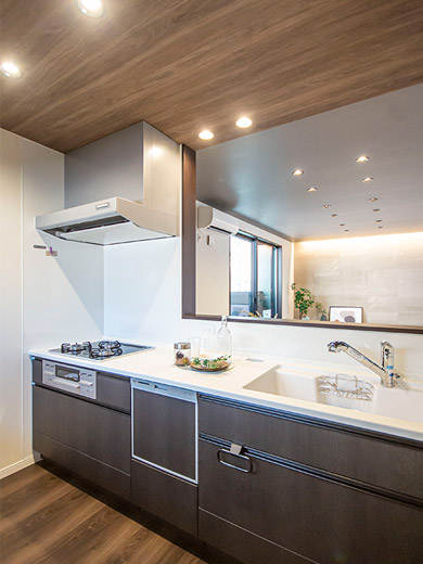 折り下げ天井を設けたキッチンです。床材に折り下げ天井のカラーを合わせました。カップボードも背面にあり、色も天井に合わせ、統一感がでるように配慮しています