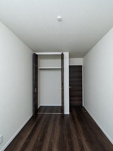 6帖の主寝室はワイドな収納を設けています。また、バルコニーへと続く大きな窓があるので、優しい光が室内へ入り込み、明るく快適に過ごしていただけます。