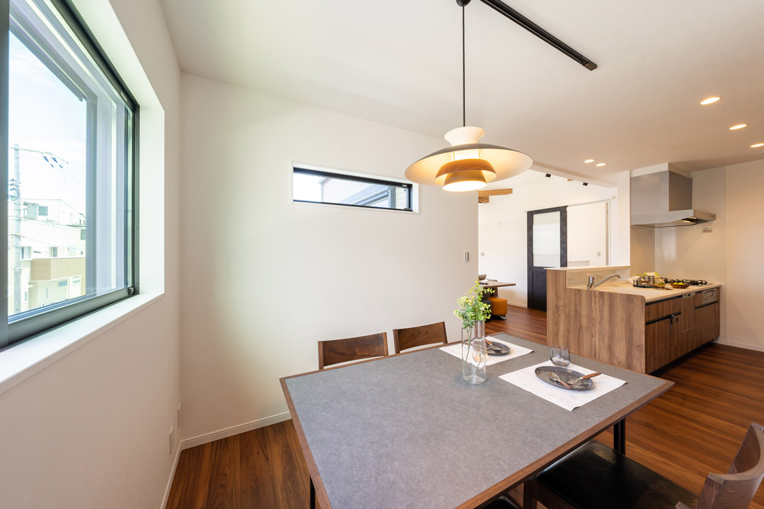 22.2帖の広さを確保したLDK。L字型になっているので、リビングとダイニングは互いに見えることがなく、同じ空間にいながらそれぞれの過ごし方を楽しんでいただけます。