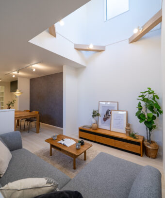 外と室内の吹き抜けが並び、開放感と光をたっぷり味わえます。また、ランドリースペースや手洗いカウンターなどあったら便利な場所にスペシャルな設計を取り入れました。