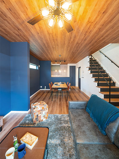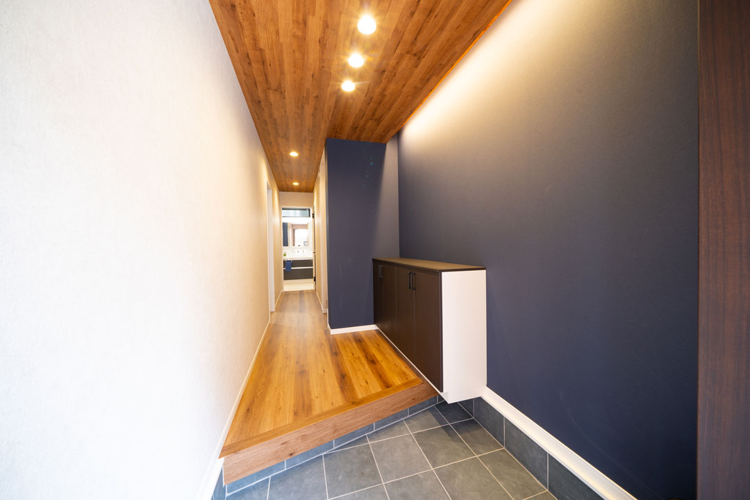 開放感を感じさせる空間設計と西海岸風のデザインがこの家の特徴です。広めの玄関や、無駄な壁や扉を省いたハンガーパイプの収納を設置するなど、開放感を演出する工夫がされています。さらにLDKはひな壇階段仕様で、より広がりを感じられる設計です。壁紙はネイビーをメインでコーディネートされていて、西海岸の雰囲気を思わせるように仕上げてあります。