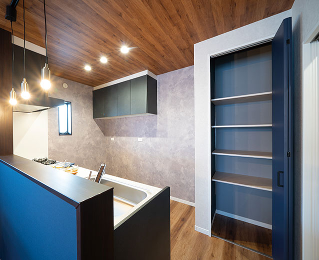 キッチン背面には可動式の棚が付いたパントリーを設けていて、食材や調理家電を収納しておくことができます。