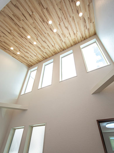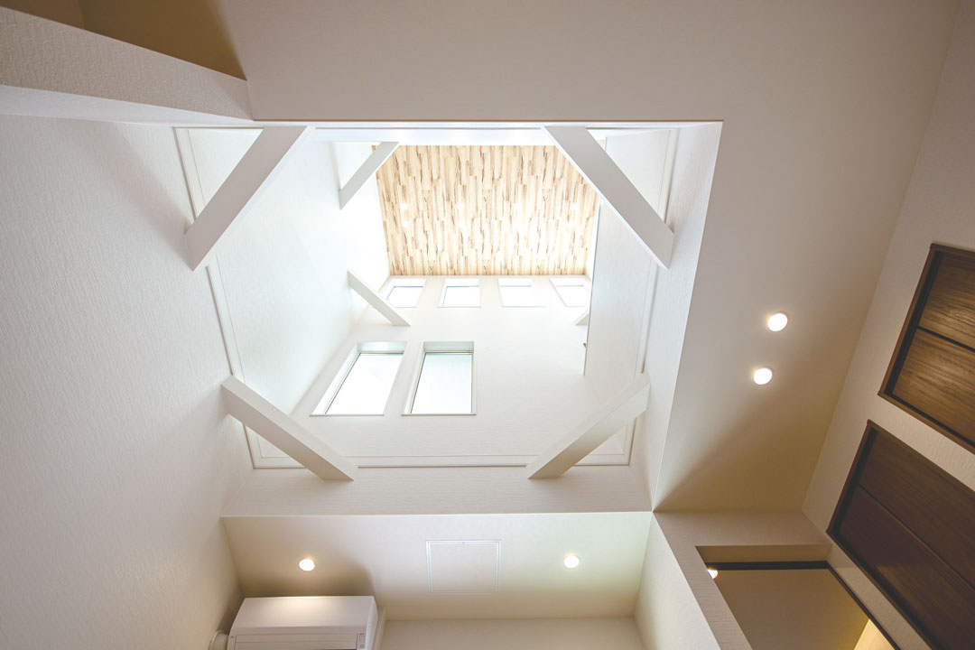2階からさらに上方向に吹き抜けが広がっており、その壁面には縦長の窓を4つ配置。勾配のついた天井部分がさらに開放感を演出します。