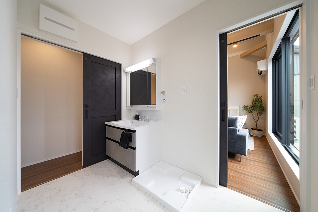 洗面脱衣室はキッチン側と廊下側の2箇所から出入りできる2WAY動線を採用。室内干しができるスペースも備えています。