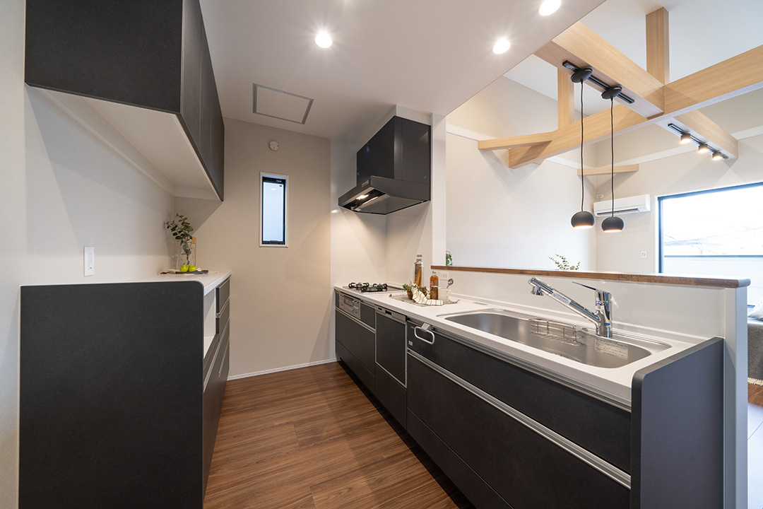 家族が快適に過ごせるバランスの良いレイアウトで、2階で生活が完結する便利な設計。リビングから洗面・浴室への2WAY動線で家事が楽になり、洗面所から直接バルコニーへも出られます。キッチン横の和室は、お子様を遊ばせながら料理ができる安心のスペース。内装はグレーを基調とし、黒い扉がスタイリッシュな雰囲気を演出しており、所々に木目の素材を取り入れ、やさしい印象に仕上げています。