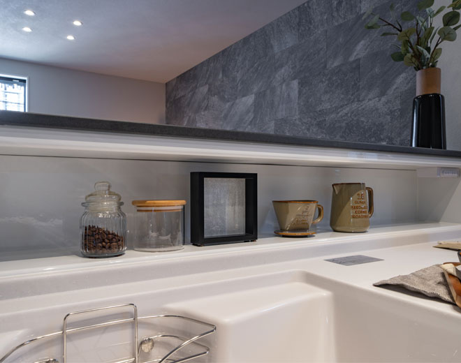 キッチン手元には便利なニッチ収納(内側収納)を設計。調味料やよく使うカップをサッと取り出せ、ワークトップを広く使いながら料理がスムーズにはかどります。