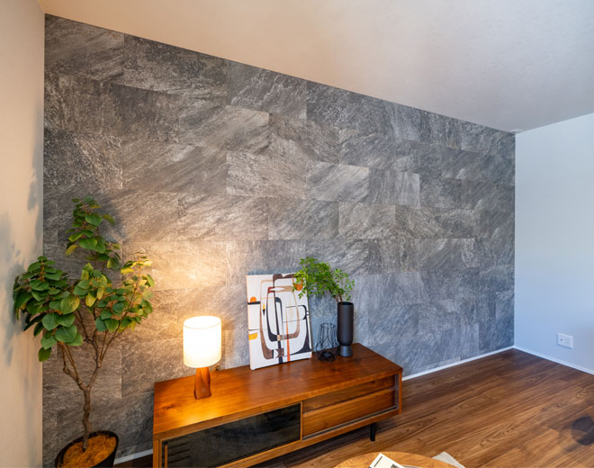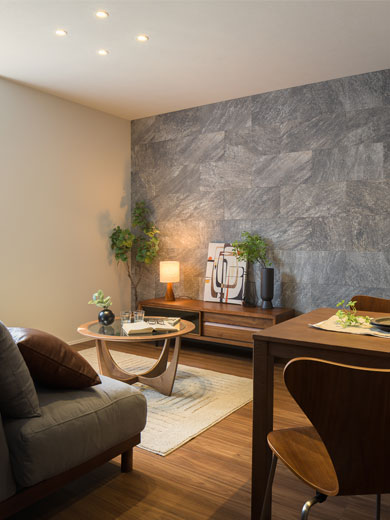 リビングの壁面には、デザイン性と機能性を兼ね備えた「エコカラット」を採用。湿度調整や脱臭効果で空気を美しく整え、常に快適な室内環境を保ちます。