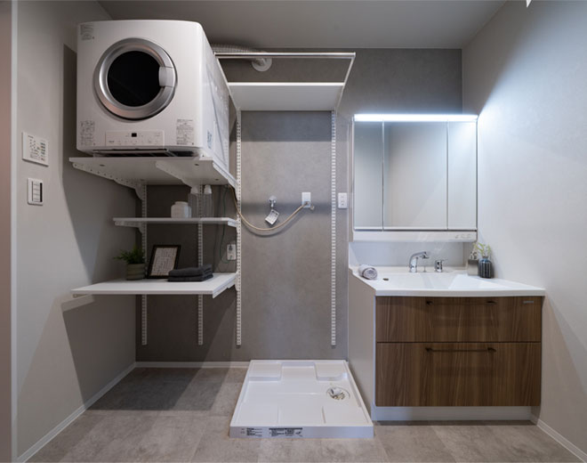ガス衣類乾燥機「乾太くん」と可動棚を備えた、ゆとりの洗面脱衣室。天候に左右されず洗濯ができ、家族並んで使える広さも魅力です。