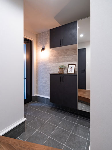 柔らかな照明が温かく迎える玄関スペース。お出かけ前の身だしなみチェックに便利な全身鏡を備え、気持ちの良い一日のスタートをサポートします。