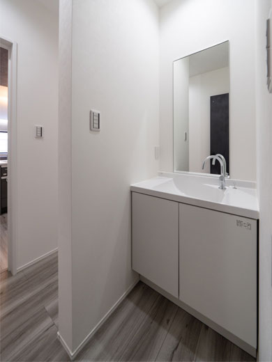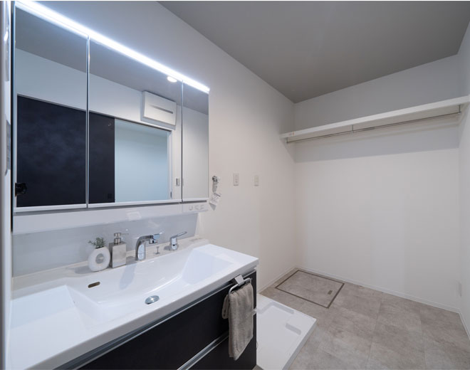 洗面室にハンガーパイプと棚があることで、「洗う・干す・畳む・しまう」がその場で完結します。天候を気にせず室内干しができ、家事の時間を大幅に短縮できるのが魅力です。