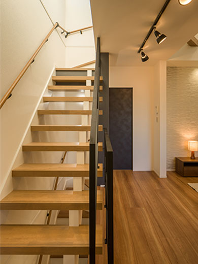 木目の踏板とオープンな手摺を組み合わせたデザインは、インテリアの一部として機能します。光や風を遮ることなく家全体へ行き渡らせ、明るく開放的な居住空間を実現します。