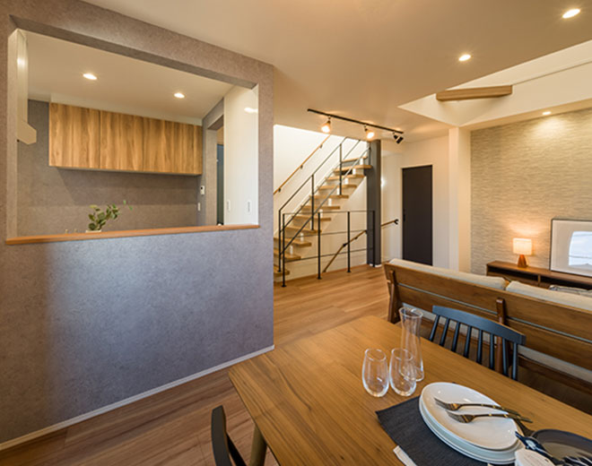 2階に配置されたLDKは、ストリップ階段と吹き抜けの相乗効果で採光性抜群。ダウンライトを効果的に配置し、夜間も明るく温かな雰囲気に包まれます。