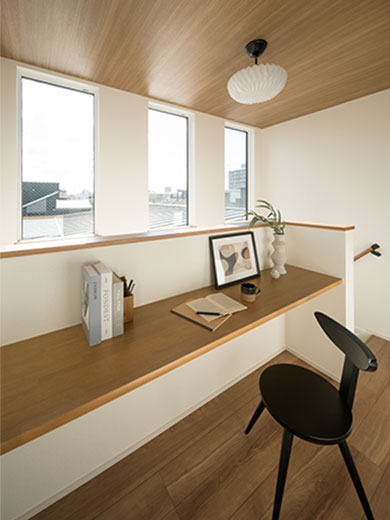3階ホールにはワークスペースを設置しました。三連窓から降り注ぐ自然光が心地よく、読書や作業に最適です。休日の午後にはコーヒーを片手に、ほっと一息つける特別な場所に。