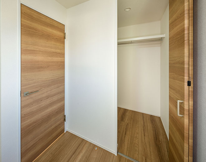 大容量の収納力を持つウォークインクローゼットを設けており、季節の衣類やスーツケースなどをまとめることができます。中で着替えや身支度もできるので、居室がすっきりと片付きます。