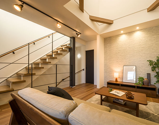リビングには開放感あふれるストリップ階段と吹き抜けを採用。ダウンライトの柔らかな光とアクセントウォールが、温かみのあるくつろぎの空間を演出します。