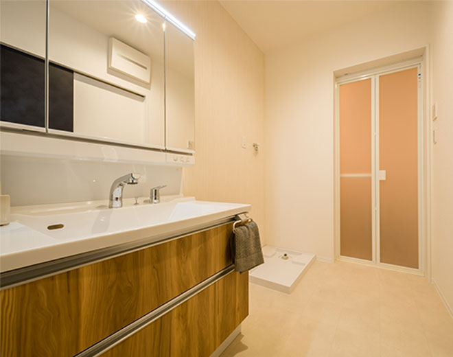 広々とした洗面脱衣室は、家族が並んで使えるゆとりの設計です。忙しい朝の時間帯でも、混み合うことなくスムーズに身支度ができます。