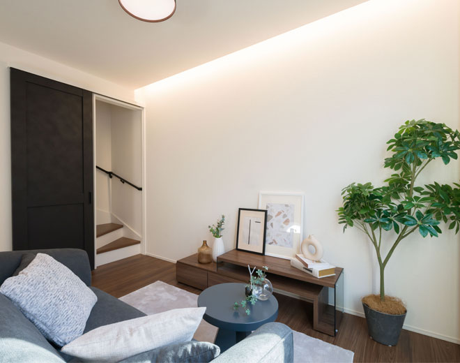 リビングの壁面には、空間に奥行きを与える間接照明を設けました。テレビ背面を照らす優しい光のグラデーションが、夜のリラックスタイムを上質に彩ります。