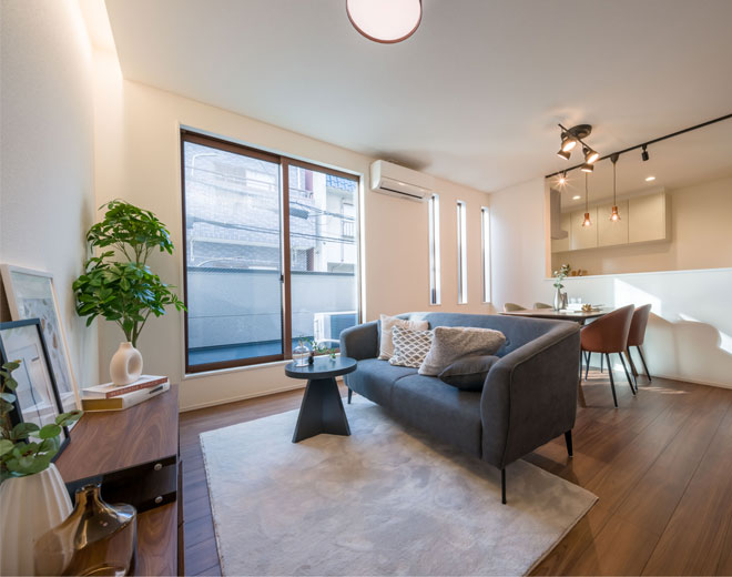 外からの視線が気にならない2階リビング設計。バルコニーと繋がることで開放感が生まれ、陽光と心地よい風が通り抜けるプライベートな寛ぎ空間です。