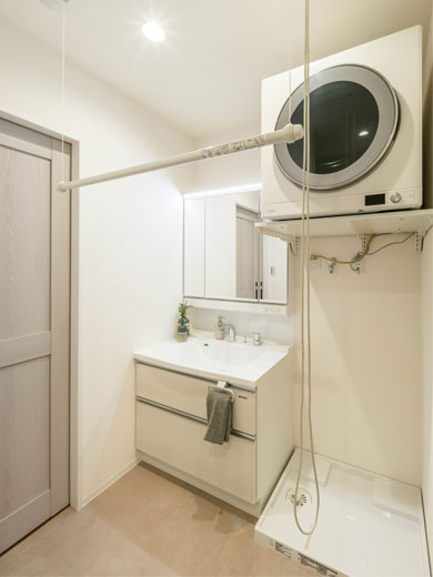 洗面脱衣室には広々としたランドリースペースを確保。「洗う・干す」がその場で完結するため、家事時間を大幅に短縮でき、毎日の暮らしにゆとりが生まれます。