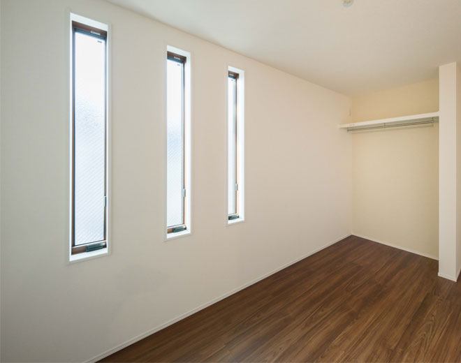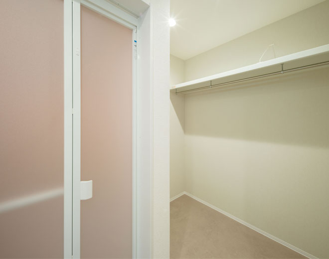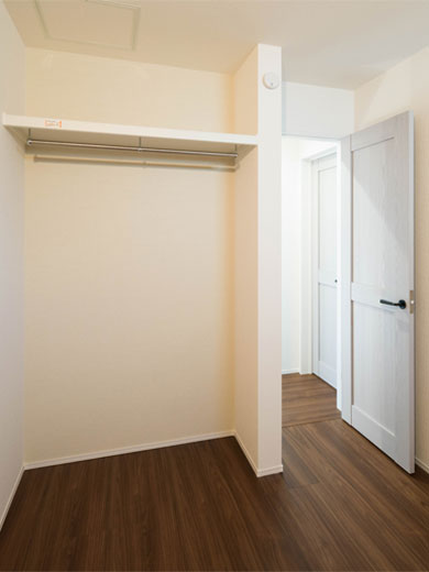 洋室には、あえて扉を設けないオープン収納を設置。お気に入りの服や翌日のコーディネートをディスプレイし、「見せる収納」として楽しみながら活用できます。