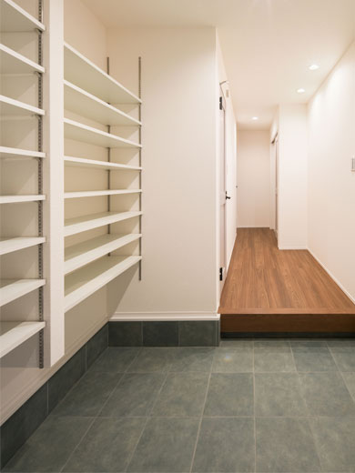 家族揃ってのお出かけでも混み合わない広々とした玄関。大容量のシューズクローゼットには、靴だけでなくアウトドア用品もすっきり収納可能です。