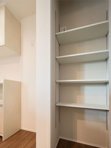 キッチン横には収納力抜群のパントリーを完備。週末のまとめ買いや、保存食・飲料・日用品のストック場所に困らず、キッチン周りを常に美しく保てます。