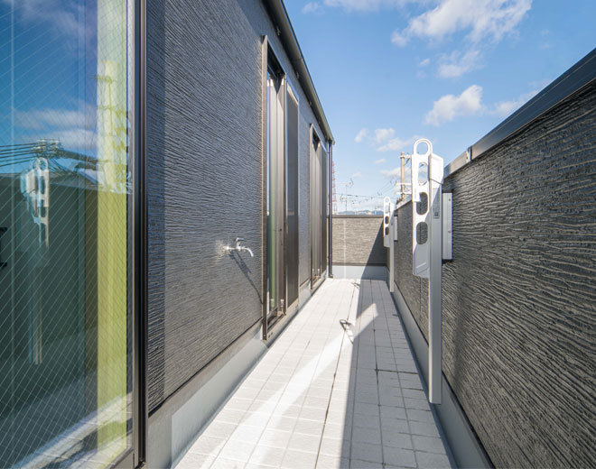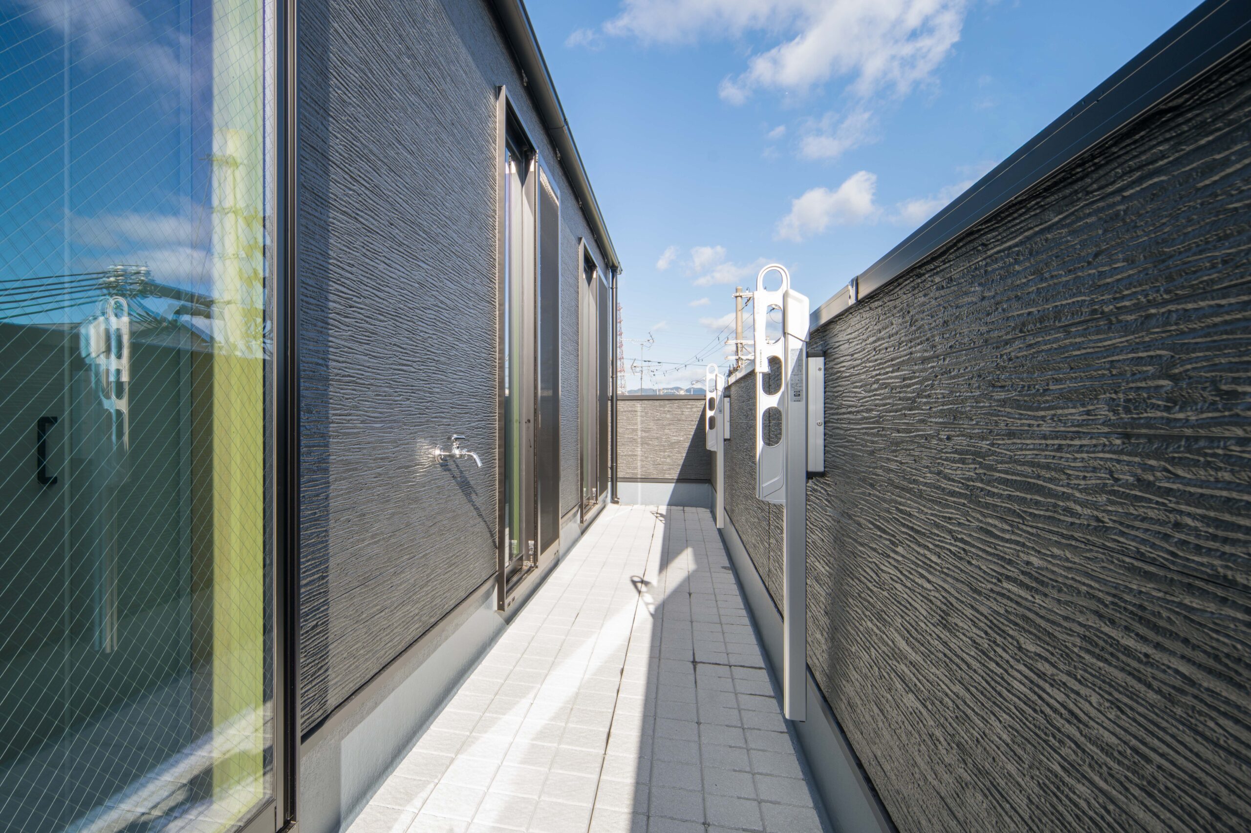 廊下や居室など、3箇所から出入りが可能なバルコニー設計。どの部屋からもアクセスしやすいため、洗濯物を干す動線がスムーズで、各部屋の換気や通風も抜群です。