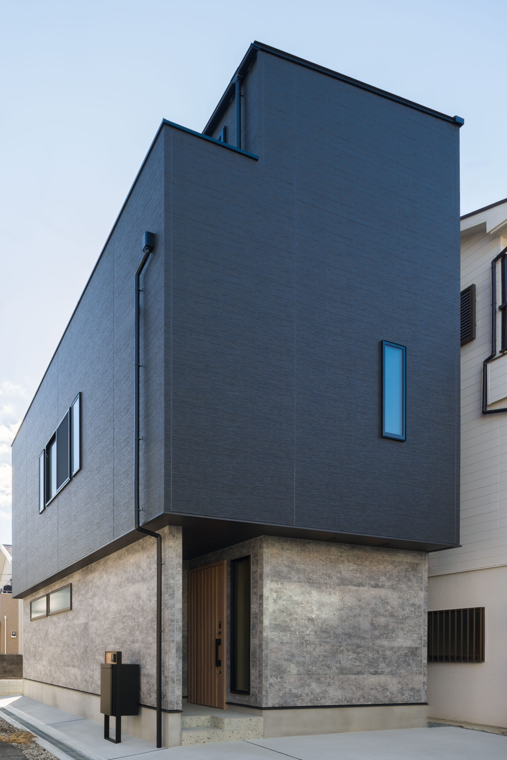 立体的なフォルムに、タイル調のアクセント壁が重厚感をプラス。光と影のコントラストが建物の表情を豊かにし、街並みの中でも洗練された存在感を感じさせます。