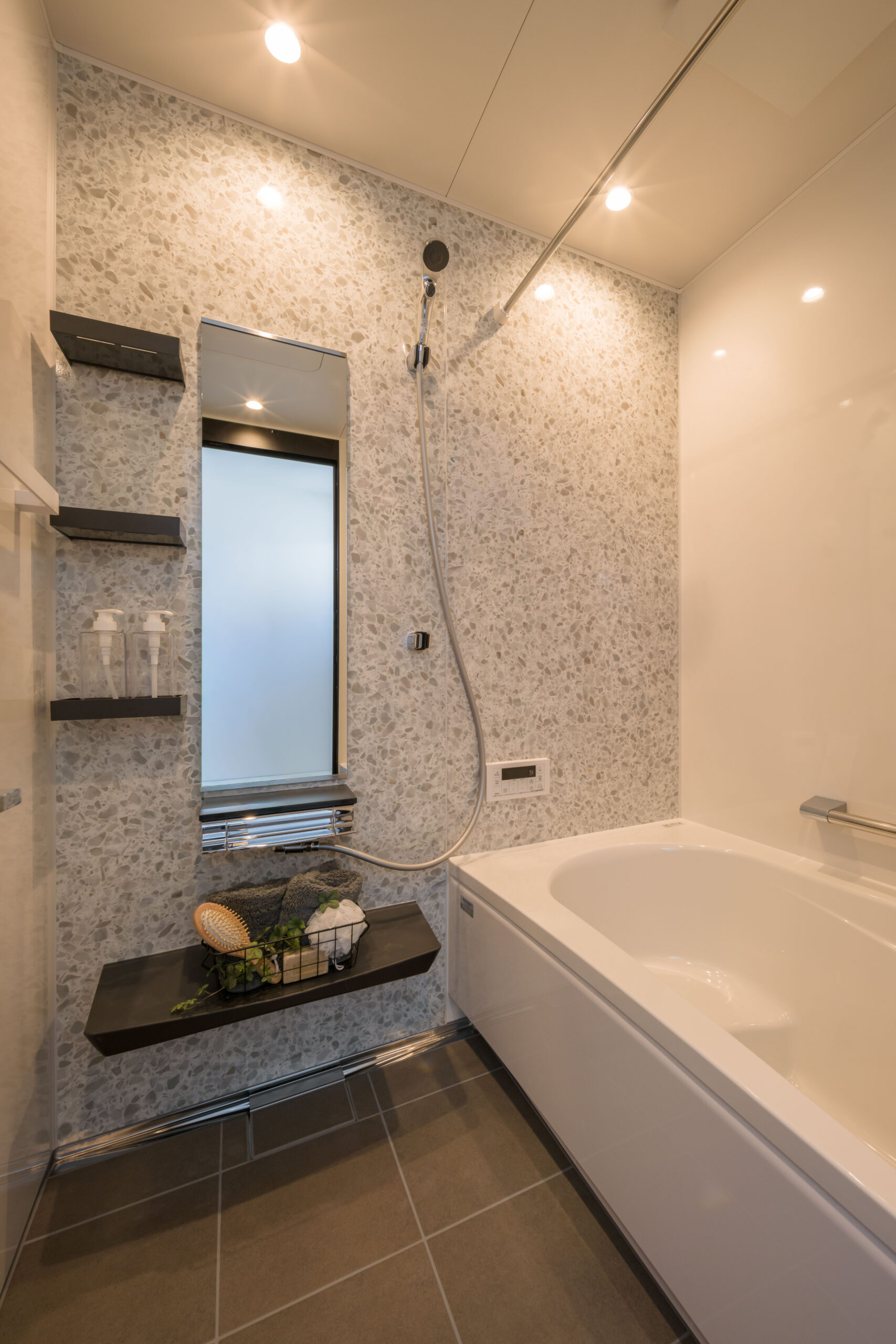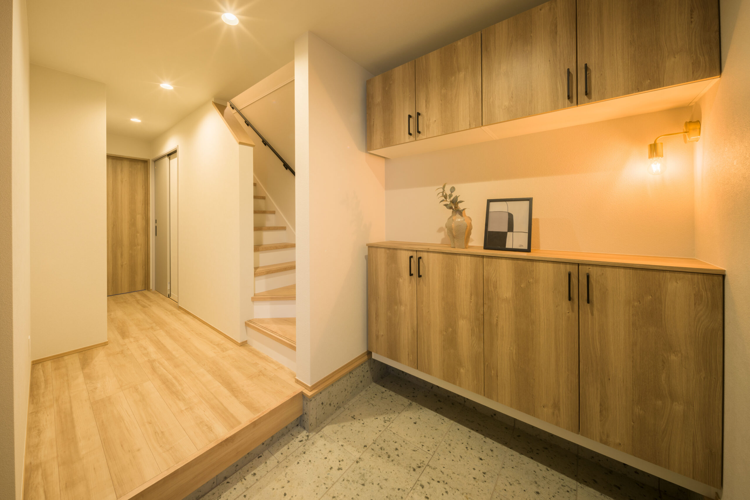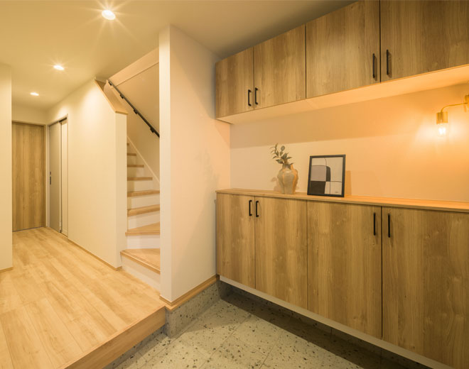 玄関ホールには高級感あふれる石目調のフロアを採用。足元の柔らかな照明演出と相まって、帰宅した家族や訪れるゲストを優雅で温かい雰囲気で出迎えます。