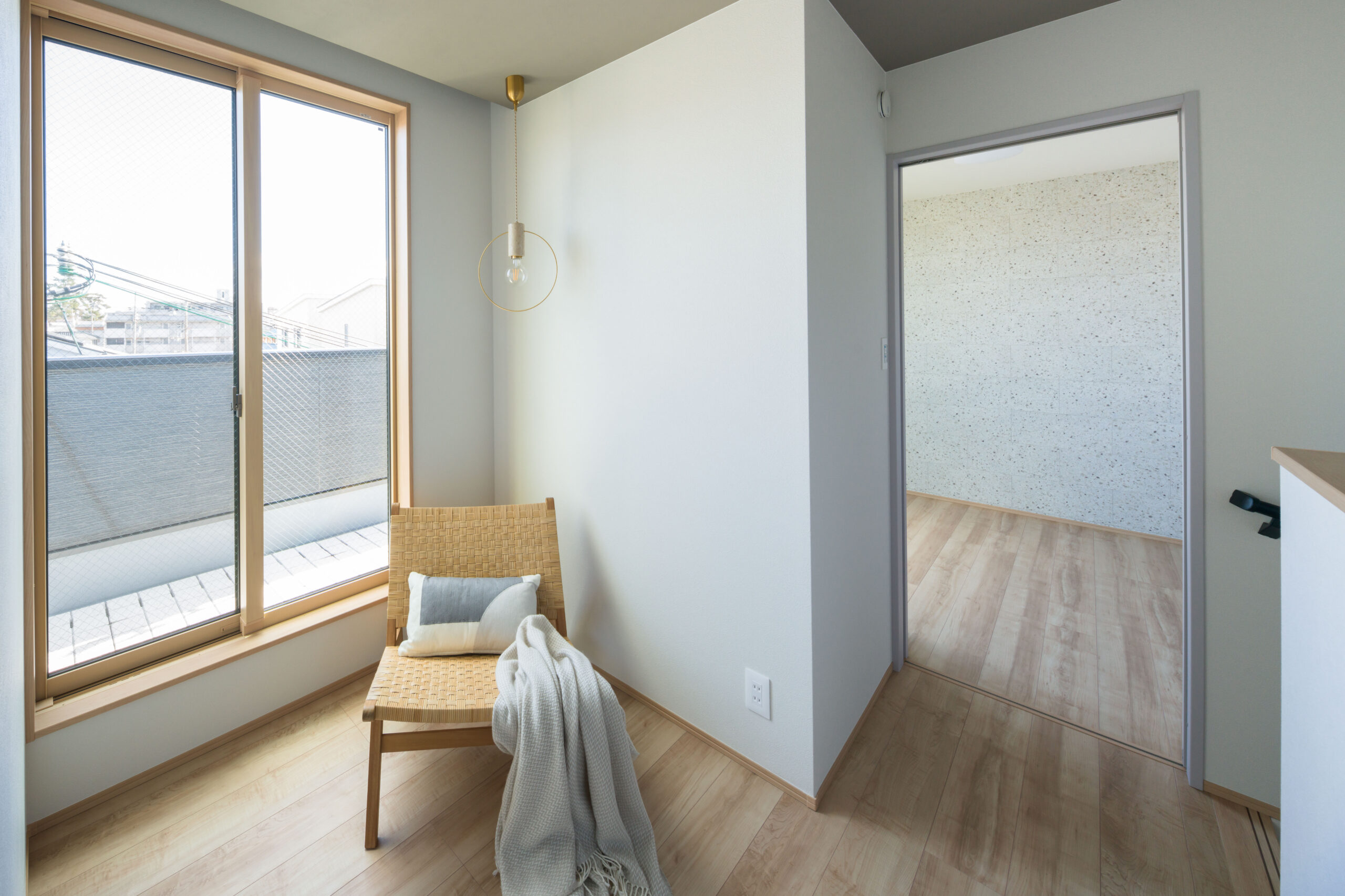 3階の階段ホールは、単なる通路ではなく「広場」のようなゆとりを確保。室内干しスペースとしてはもちろん、椅子を置いて読書を楽しんだり、お子様の遊び場としても使える多目的空間です。