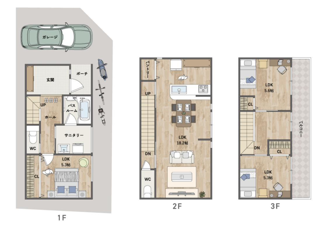 プライベートと共有スペースを明確に分けた、メリハリのあるプランです。1階には個室と水回りを集約し、生活動線をコンパクトに完結。2階はワンフロアを贅沢に使った18.2帖の広々LDKで、家族が自然と集まる開放的な空間に。3階にはバルコニーに面した2つの洋室を配置し、光と風を感じながら個々の時間を大切にできます。家族の団らんと個のプライバシーを両立させた、バランスの良い住まいです。