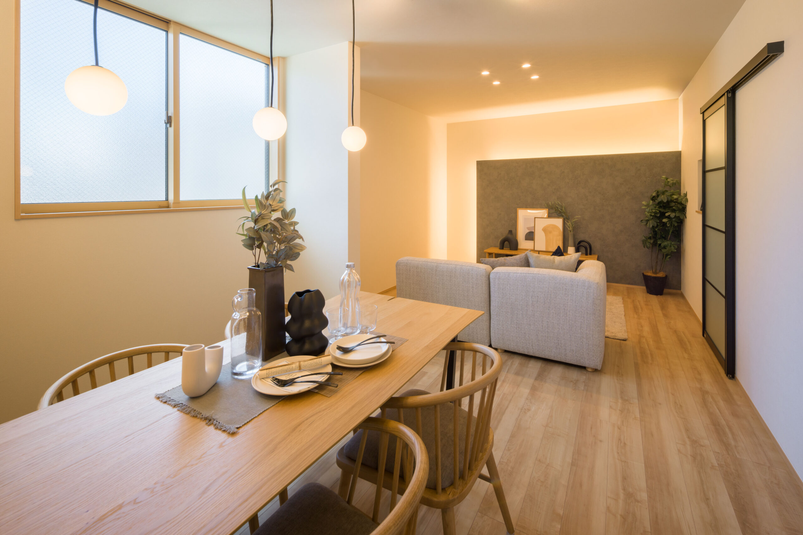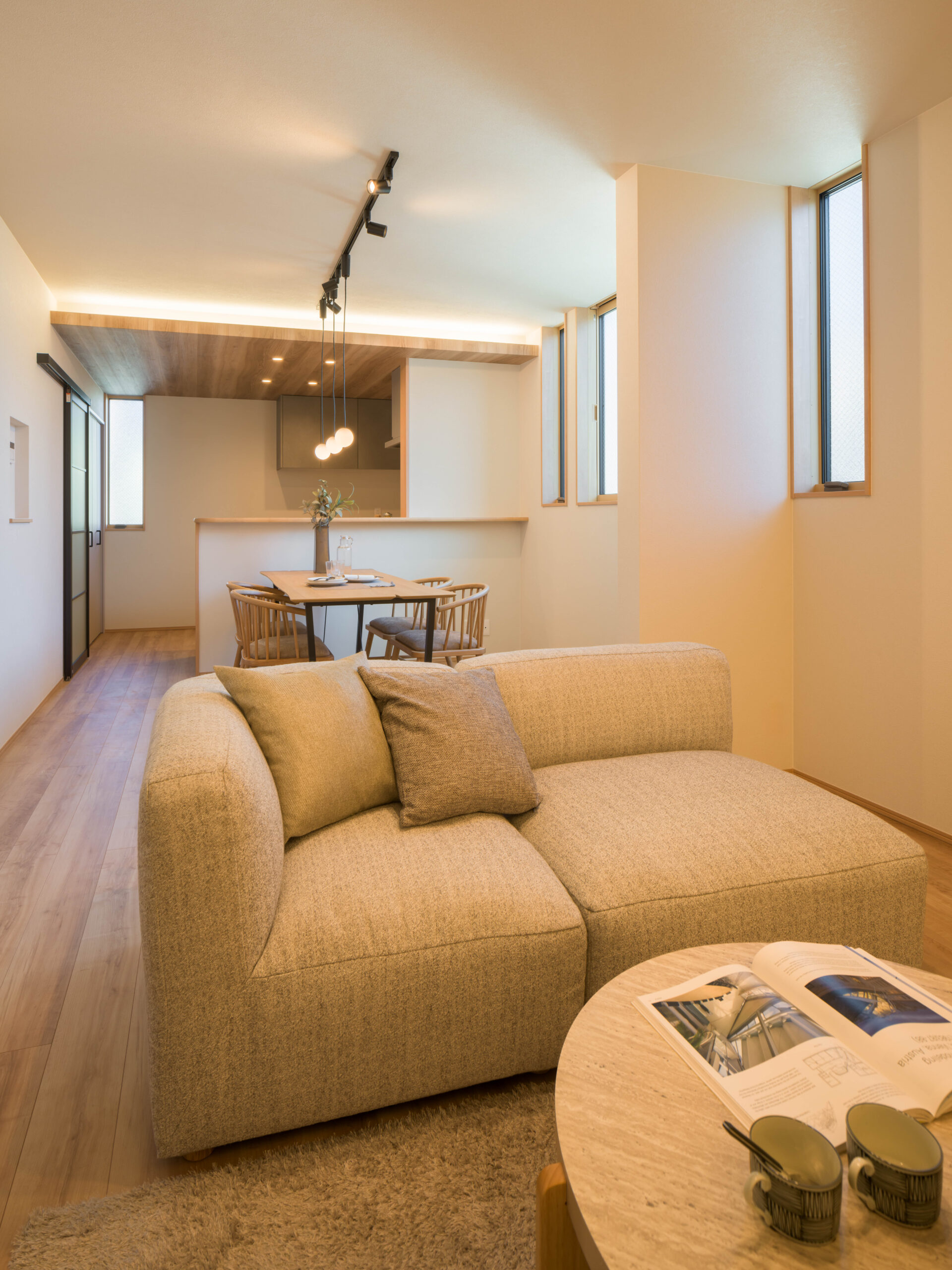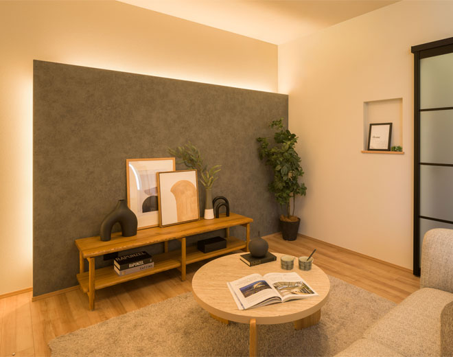 リビングの壁面には、柔らかな光が広がる間接照明を設置しました。夜はメイン照明を落として、ホテルのラウンジのような落ち着いた雰囲気の中でリラックスタイムを楽しめます。