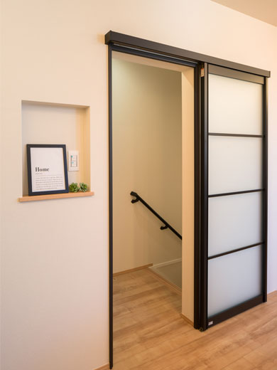 壁の厚みを利用した「ニッチ」。インターホンやスイッチ類をまとめてスッキリさせたり、思い出の写真や季節の小物を飾るギャラリースペースとしても活躍します。