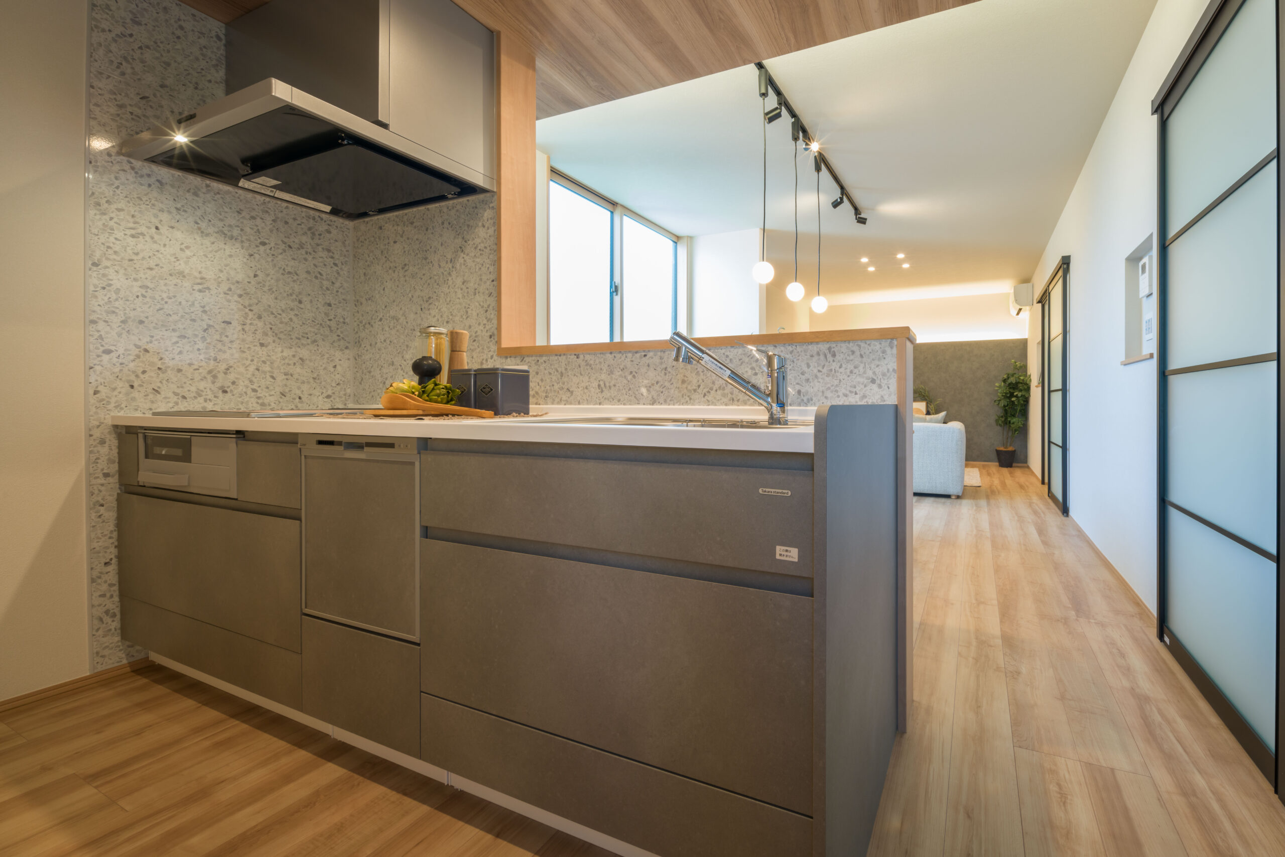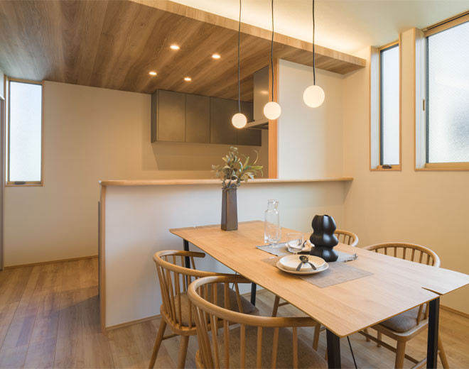 キッチンの天井高をあえて下げ、木目などのアクセントクロスを施した「折り下げ天井」。LDKの中でキッチンスペースを視覚的にゾーニングし、奥行きと温かみのある空間を演出します。