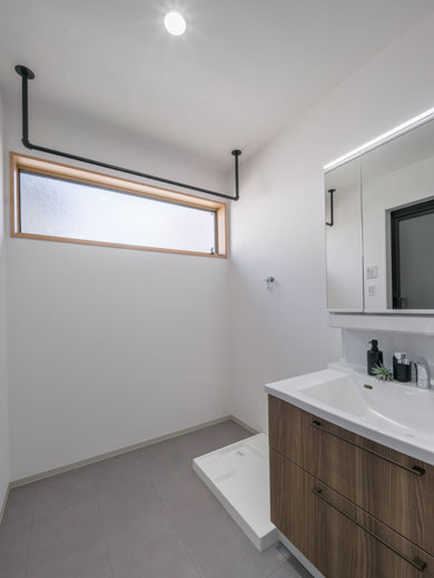 洗面脱衣室には、黒のアイアンハンガーパイプを標準装備。洗濯物を洗濯機から出してすぐに干せる家事ラク動線に加え、空間を引き締めるお洒落なアクセントとしても機能します。