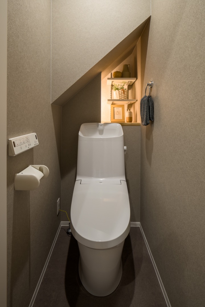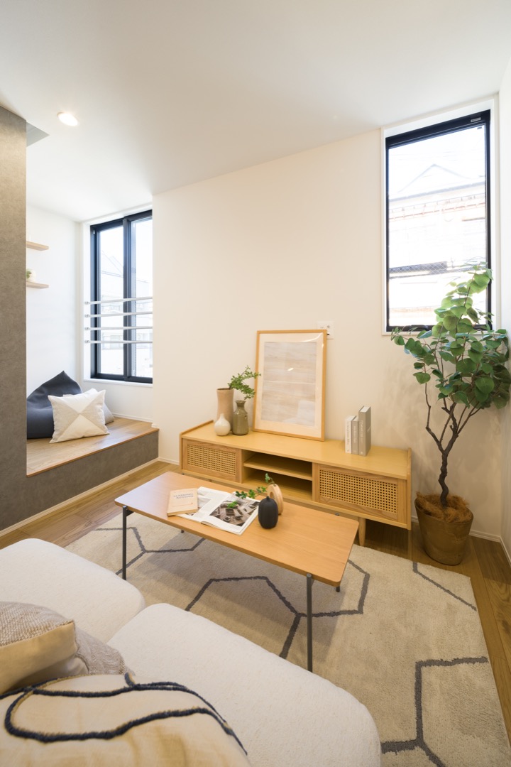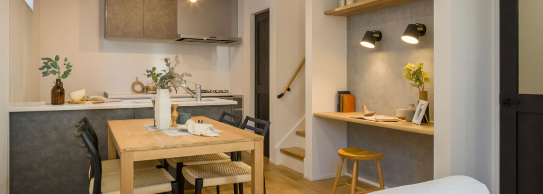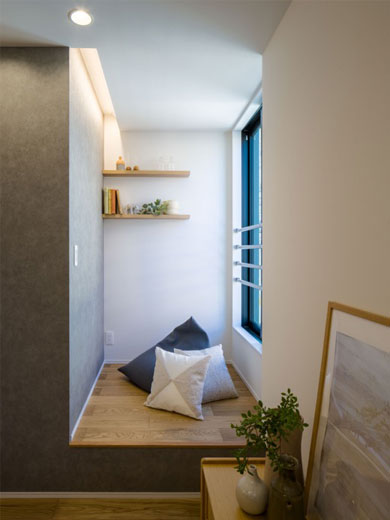 2階LDKの一角に、小上がりの「ヌック」を設置。便利な棚やハンガーパイプ付きで、読書やお昼寝、キッズスペースなど多目的に大活躍します。