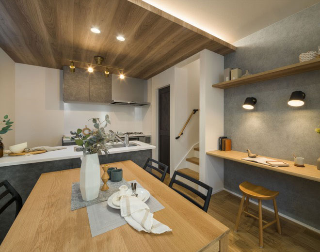 LDKの天井の一部に折り下げ天井を採用しました。空間にメリハリを持たせ、カフェのように洗練されたお洒落なデザイン性をプラスしています。