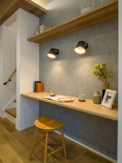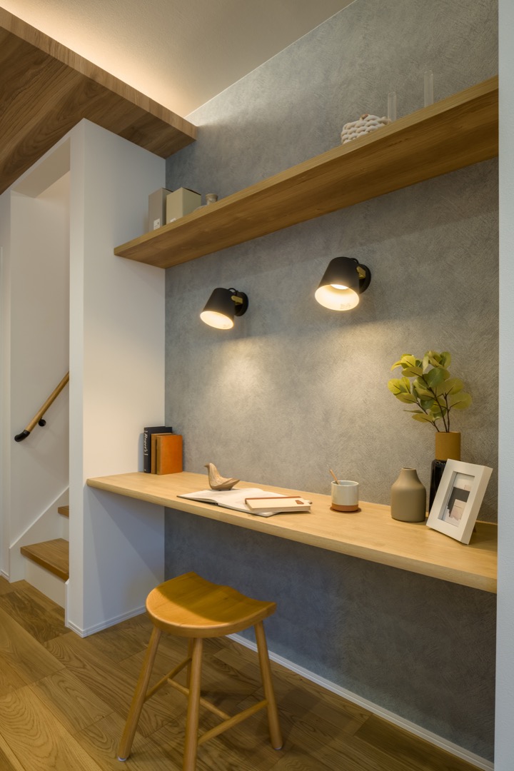 リビングに独立したワークスペースを確保しました。テレワークでの作業や趣味の空間として、静かに集中できるプライベートな環境が整っています。