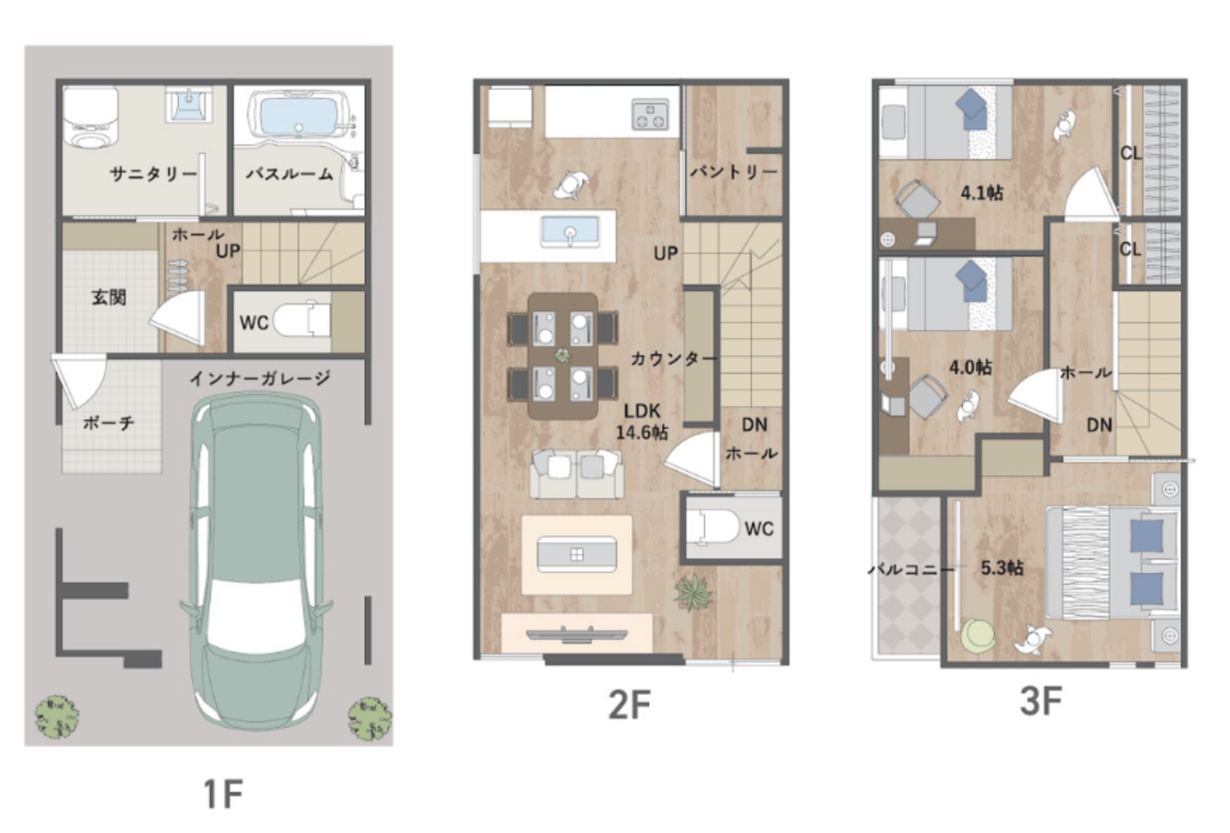 敷地の有効活用ができる3階建ての注文住宅。都市部ならではの施工事例です。