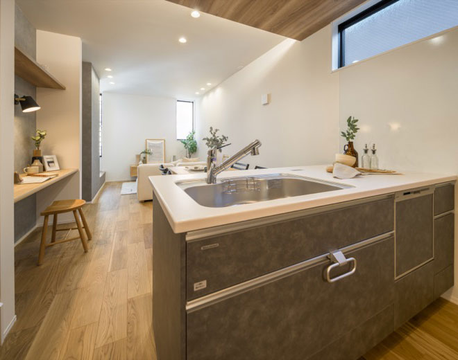 作業スペースが広く複数人でも料理がしやすいⅡ型フラットキッチン。ダイニングとの繋がりが良く、料理の配膳もスムーズに行える家事ラクな設計です。