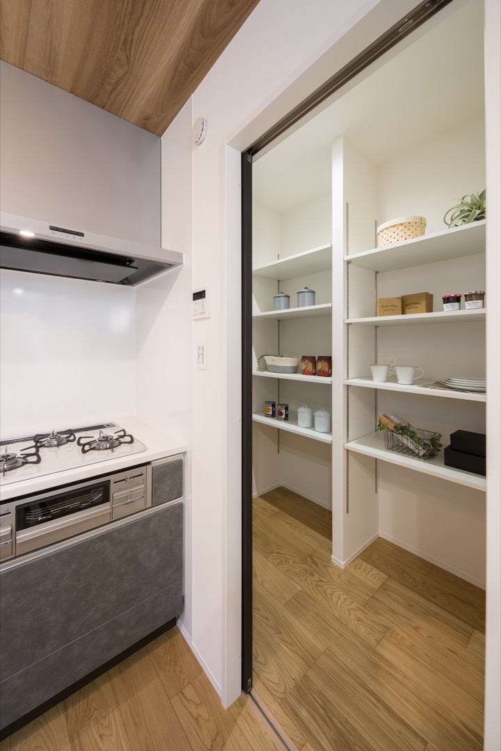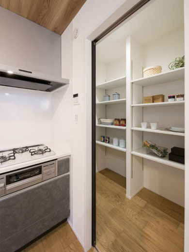 キッチン横に独立したウォークインパントリーを配置。可動棚付きで食品や日用品のストックを大容量収納でき、LDKを常に美しくスッキリ保てます。