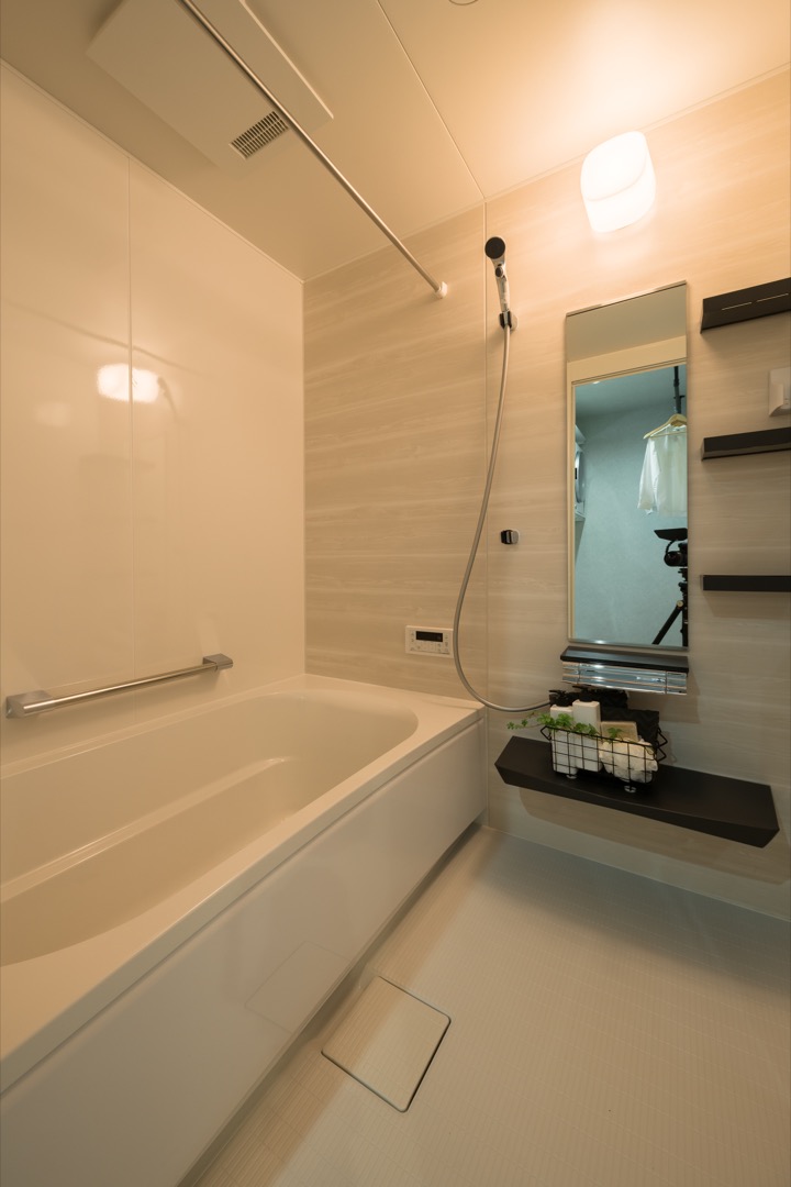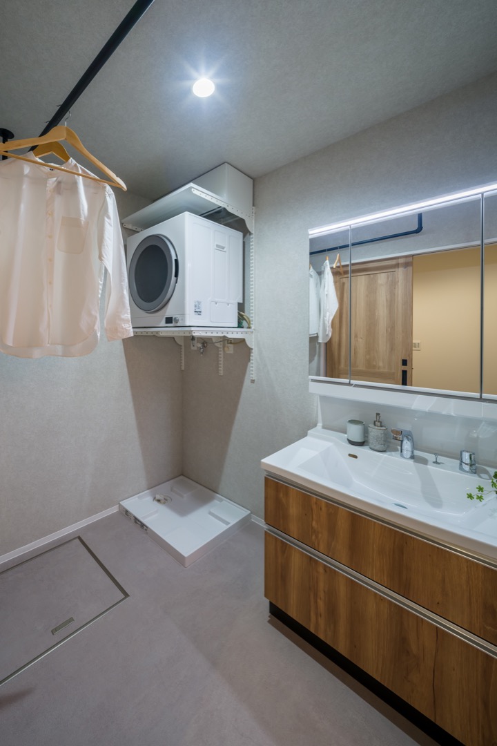 1階洗面室には大人気のガス衣類乾燥機「乾太くん」を完備。干す・掛けるがその場で完結するハンガーパイプも備え、究極の洗濯動線を実現しました。