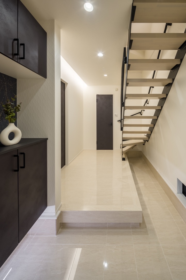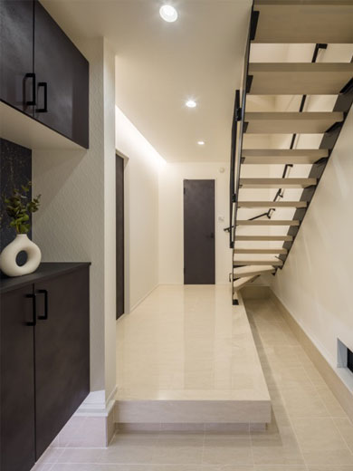 広々とした上がり框と1階ホールの間接照明が目を惹く、ゆとりあるL字型玄関です。ベビーカー等も置きやすく、家族やお客様を優しく迎えます。