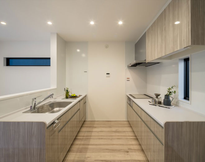作業スペースを広く確保できるセパレートタイプのⅡ型キッチンを採用しました。複数人でも料理がしやすく、毎日の家事効率が格段にアップします。
