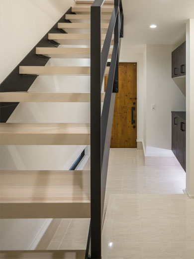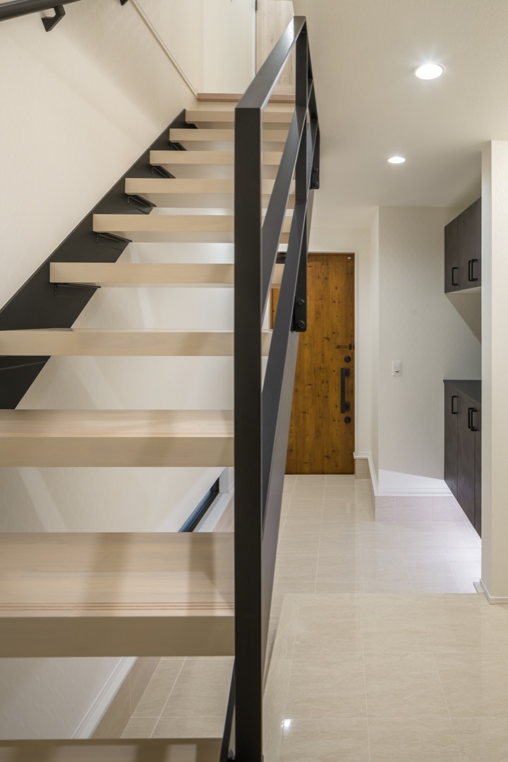 インテリアとしても映える、お洒落な鉄骨階段を採用しました。視線が抜けるデザインなので、空間全体に広がりと開放感をもたらしてくれます。