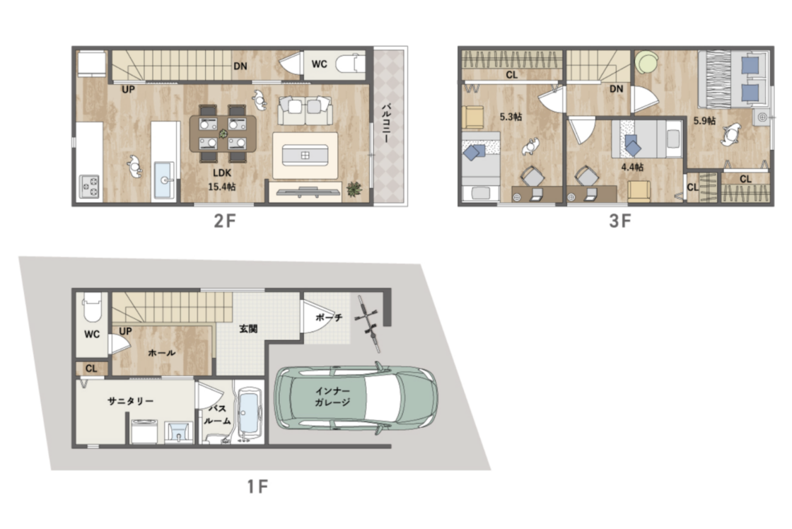 敷地の有効活用ができる3階建ての注文住宅。都市部ならではの施工事例です。